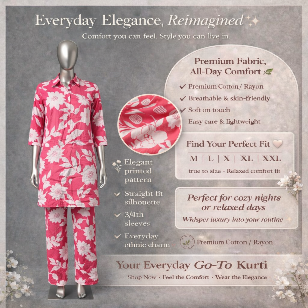 Step out in style with this chic Co-ord Set, featuring Premium Cotton/Rayon for the ultimate soft touch. The lightweight and skin-friendly material ensures you stay comfortable while looking effortlessly put together. Designed for the modern lifestyle, this easy care set is perfect for lounging or stepping out.