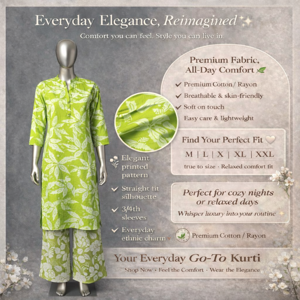 Step out in style with this chic Co-ord Set, featuring Premium Cotton/Rayon for the ultimate soft touch. The lightweight and skin-friendly material ensures you stay comfortable while looking effortlessly put together. Designed for the modern lifestyle, this easy care set is perfect for lounging or stepping out.