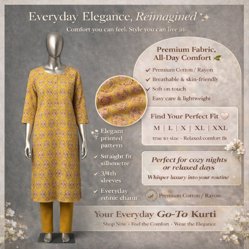 Experience everyday elegance with our Premium Kurti, crafted from high-quality Cotton/Rayon for a breathable, skin-friendly feel. Designed to be soft to the touch and lightweight, it offers effortless comfort that lasts from morning to night. Enjoy a stylish look with easy care fabric that keeps you fresh and polished with zero hassle.