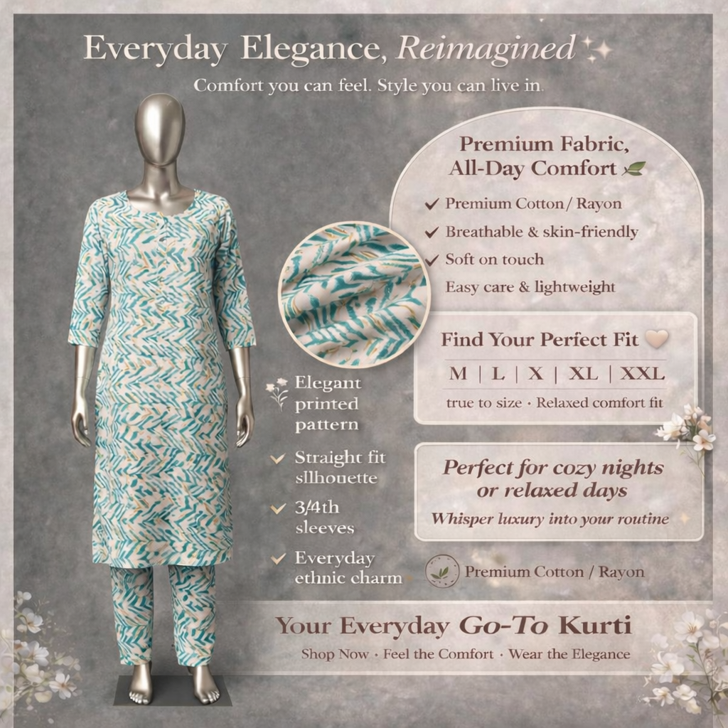 Experience everyday elegance with our Premium Kurti, crafted from high-quality Cotton/Rayon for a breathable, skin-friendly feel. Designed to be soft to the touch and lightweight, it offers effortless comfort that lasts from morning to night. Enjoy a stylish look with easy care fabric that keeps you fresh and polished with zero hassle.