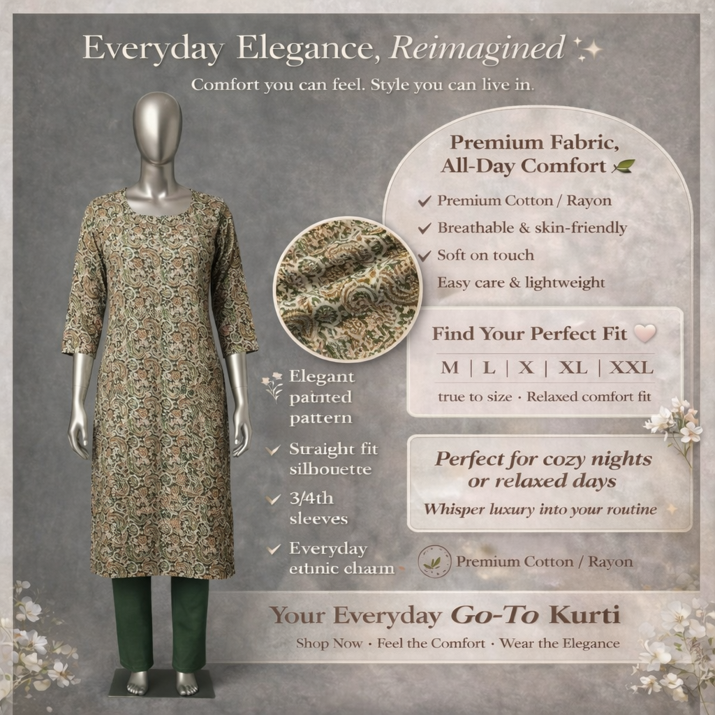 Redefine your daily wardrobe with this soft, lightweight Kurti that blends tradition with modern comfort. Made from Premium Cotton/Rayon, it is incredibly skin-friendly and perfect for all-day wear. A durable, easy care staple that ensures you look sophisticated while feeling completely relaxed.