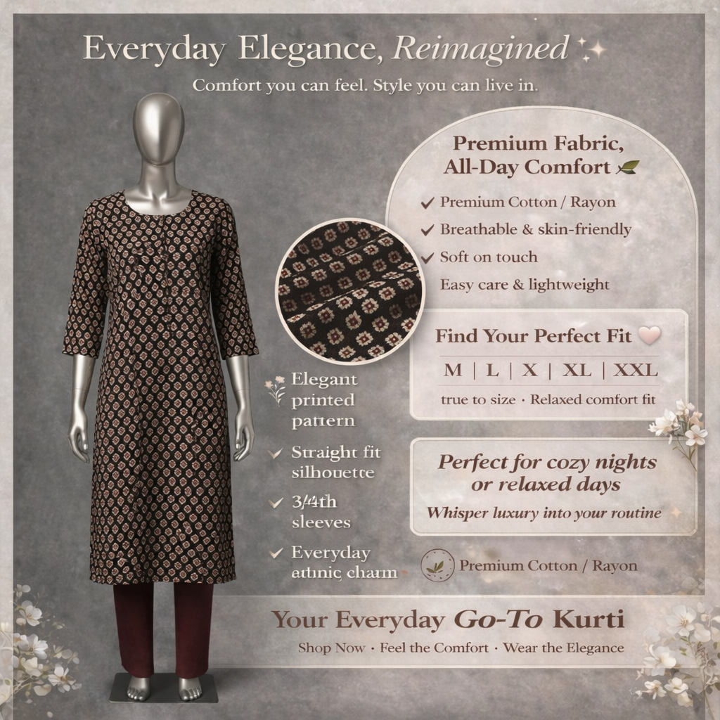 Experience everyday elegance with our Premium Kurti, crafted from high-quality Cotton/Rayon for a breathable, skin-friendly feel. Designed to be soft to the touch and lightweight, it offers effortless comfort that lasts from morning to night. Enjoy a stylish look with easy care fabric that keeps you fresh and polished with zero hassle.