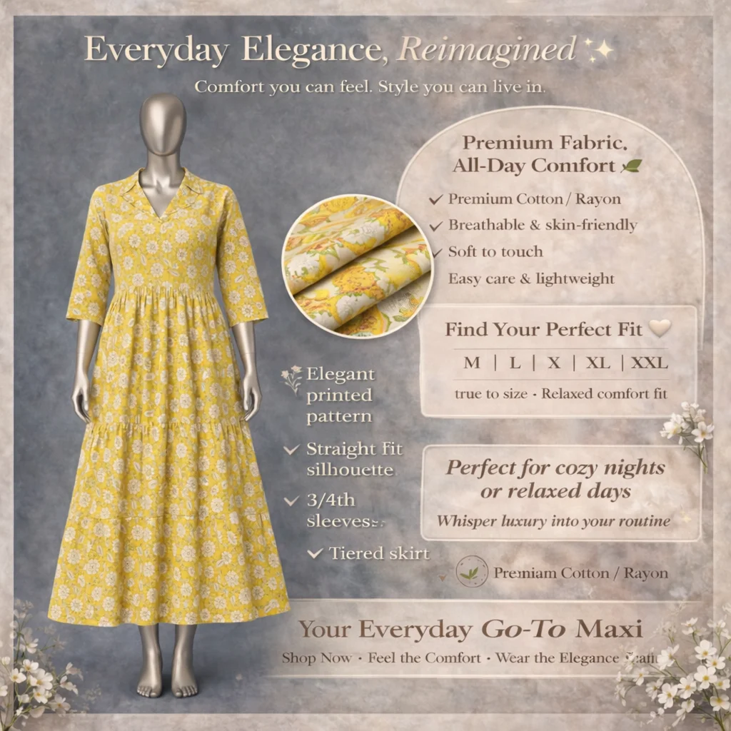 Flow with grace in this exquisite Long Gown, tailored from Premium Cotton/Rayon for a regal yet comfortable fit. The soft, skin-friendly texture hugs you gently, while the lightweight design keeps you breezy all day. Perfect for special moments, this easy care gown combines durability with timeless beauty.