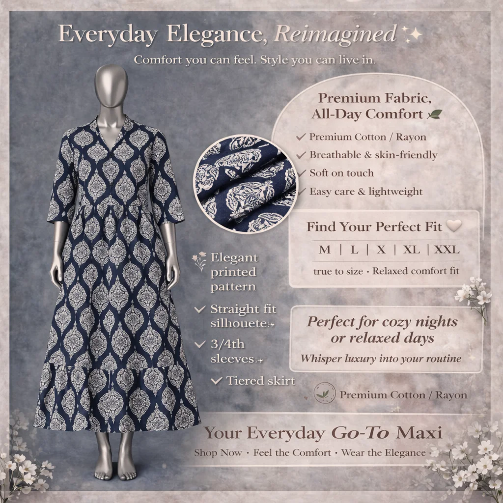 Flow with grace in this exquisite Long Gown, tailored from Premium Cotton/Rayon for a regal yet comfortable fit. The soft, skin-friendly texture hugs you gently, while the lightweight design keeps you breezy all day. Perfect for special moments, this easy care gown combines durability with timeless beauty.