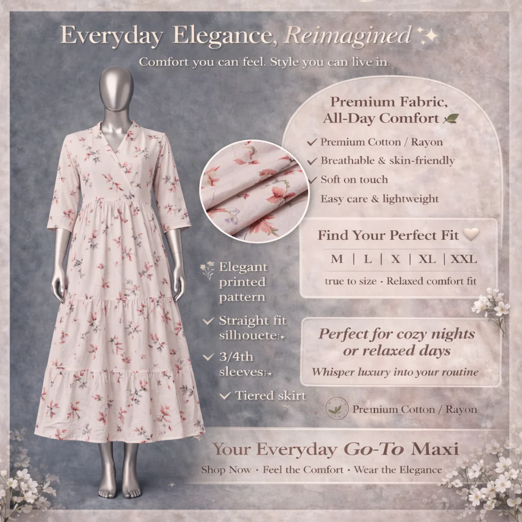 Flow with grace in this exquisite Long Gown, tailored from Premium Cotton/Rayon for a regal yet comfortable fit. The soft, skin-friendly texture hugs you gently, while the lightweight design keeps you breezy all day. Perfect for special moments, this easy care gown combines durability with timeless beauty.