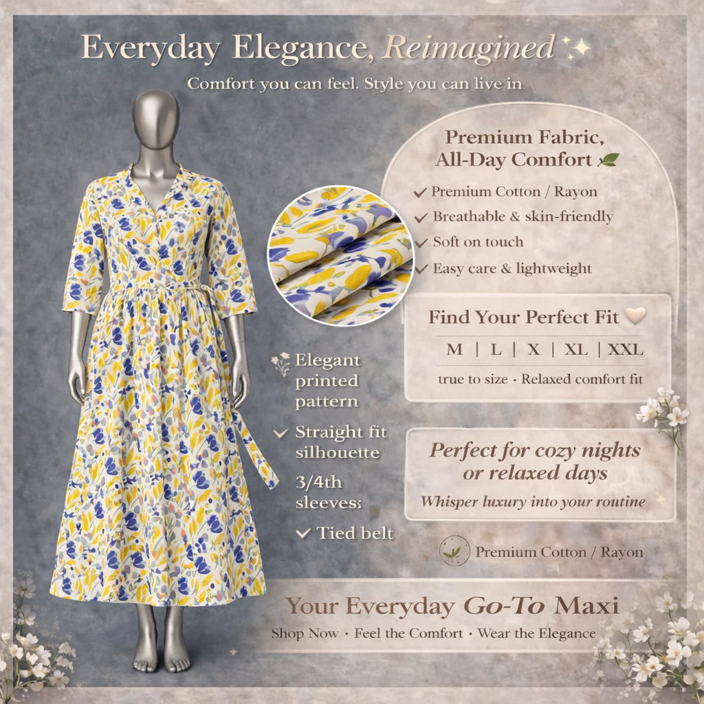 Flow with grace in this exquisite Long Gown, tailored from Premium Cotton/Rayon for a regal yet comfortable fit. The soft, skin-friendly texture hugs you gently, while the lightweight design keeps you breezy all day. Perfect for special moments, this easy care gown combines durability with timeless beauty.