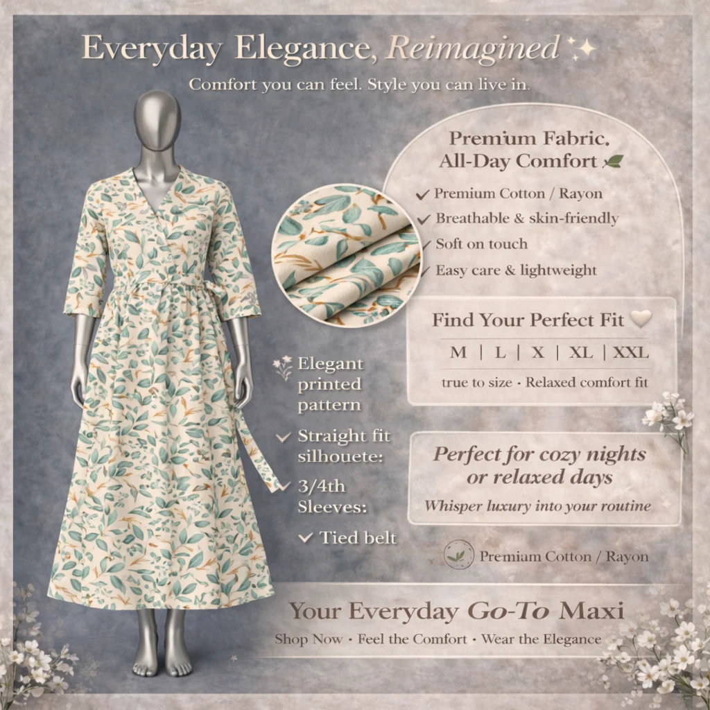 Flow with grace in this exquisite Long Gown, tailored from Premium Cotton/Rayon for a regal yet comfortable fit. The soft, skin-friendly texture hugs you gently, while the lightweight design keeps you breezy all day. Perfect for special moments, this easy care gown combines durability with timeless beauty.