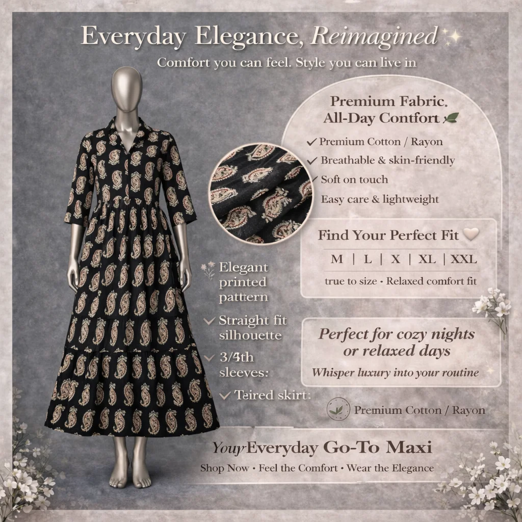 Flow with grace in this exquisite Long Gown, tailored from Premium Cotton/Rayon for a regal yet comfortable fit. The soft, skin-friendly texture hugs you gently, while the lightweight design keeps you breezy all day. Perfect for special moments, this easy care gown combines durability with timeless beauty.
