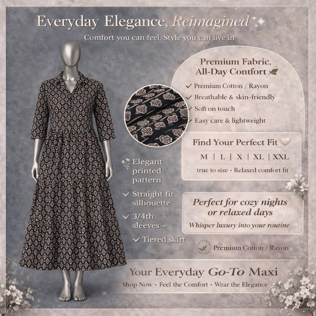 Flow with grace in this exquisite Long Gown, tailored from Premium Cotton/Rayon for a regal yet comfortable fit. The soft, skin-friendly texture hugs you gently, while the lightweight design keeps you breezy all day. Perfect for special moments, this easy care gown combines durability with timeless beauty.
