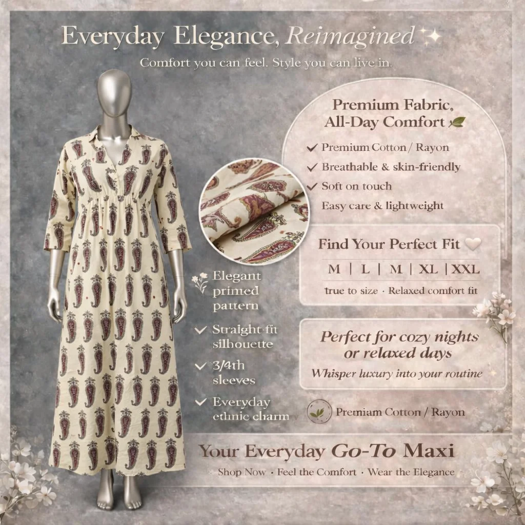 Discover the perfect blend of style and ease with this Premium Long Gown, crafted from high-quality Cotton/Rayon. Its lightweight and soft construction makes it incredibly skin-friendly, ideal for long hours of wear. Experience high-fashion aesthetics with easy care practicality for a look that truly shines.