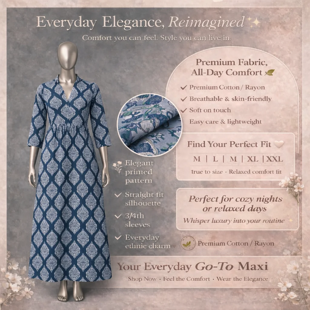 Wrap yourself in the luxury of our Premium Long Gown, designed with soft, skin-friendly fabric for delicate comfort. The Premium Cotton/Rayon material offers a lightweight drape that moves beautifully with every step. An elegant choice that is surprisingly easy care, ensuring you look stunning without the fuss.