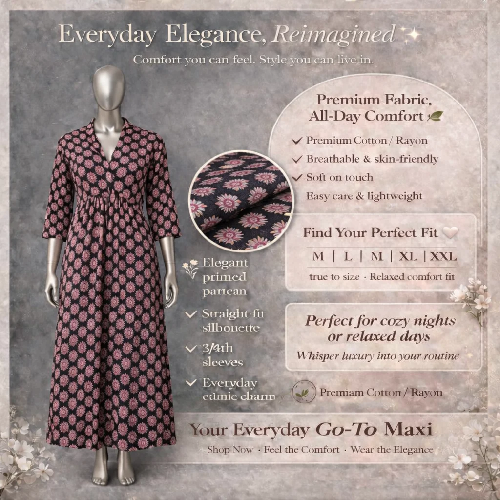 Discover the perfect blend of style and ease with this Premium Long Gown, crafted from high-quality Cotton/Rayon. Its lightweight and soft construction makes it incredibly skin-friendly, ideal for long hours of wear. Experience high-fashion aesthetics with easy care practicality for a look that truly shines.
