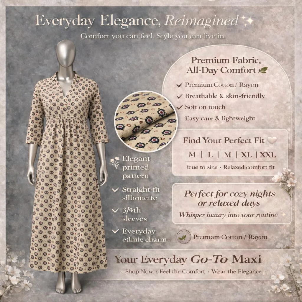 Discover the perfect blend of style and ease with this Premium Long Gown, crafted from high-quality Cotton/Rayon. Its lightweight and soft construction makes it incredibly skin-friendly, ideal for long hours of wear. Experience high-fashion aesthetics with easy care practicality for a look that truly shines.