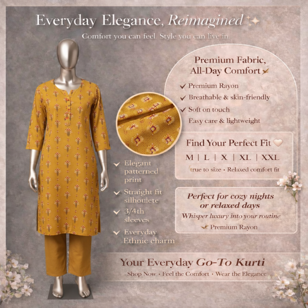 Your new go-to for casual chic, this Kurti features Premium fabric that feels luxuriously soft against your skin. The Premium Rayon weave provides a lightweight and skin-friendly fit, perfect for any season. Simple to wash and easy care, it delivers style and convenience in one beautiful package.