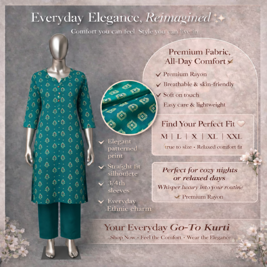 Redefine your daily wardrobe with this soft, lightweight Kurti that blends tradition with modern comfort. Made from Premium Rayon, it is incredibly skin-friendly and perfect for all-day wear. A durable, easy care staple that ensures you look sophisticated while feeling completely relaxed.