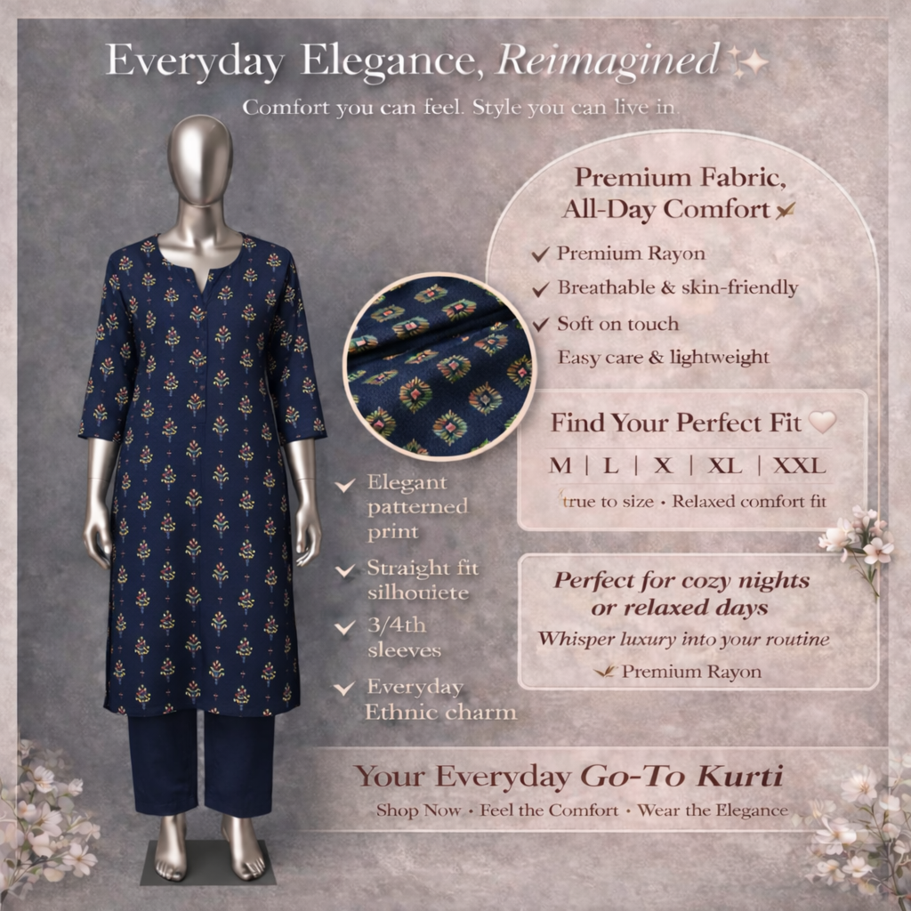 Redefine your daily wardrobe with this soft, lightweight Kurti that blends tradition with modern comfort. Made from Premium Rayon, it is incredibly skin-friendly and perfect for all-day wear. A durable, easy care staple that ensures you look sophisticated while feeling completely relaxed.