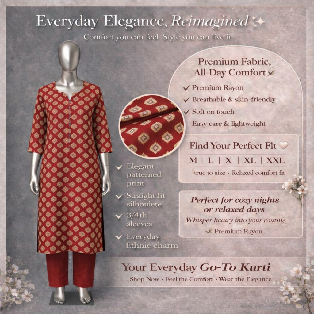 Your new go-to for casual chic, this Kurti features Premium fabric that feels luxuriously soft against your skin. The Premium Rayon weave provides a lightweight and skin-friendly fit, perfect for any season. Simple to wash and easy care, it delivers style and convenience in one beautiful package.